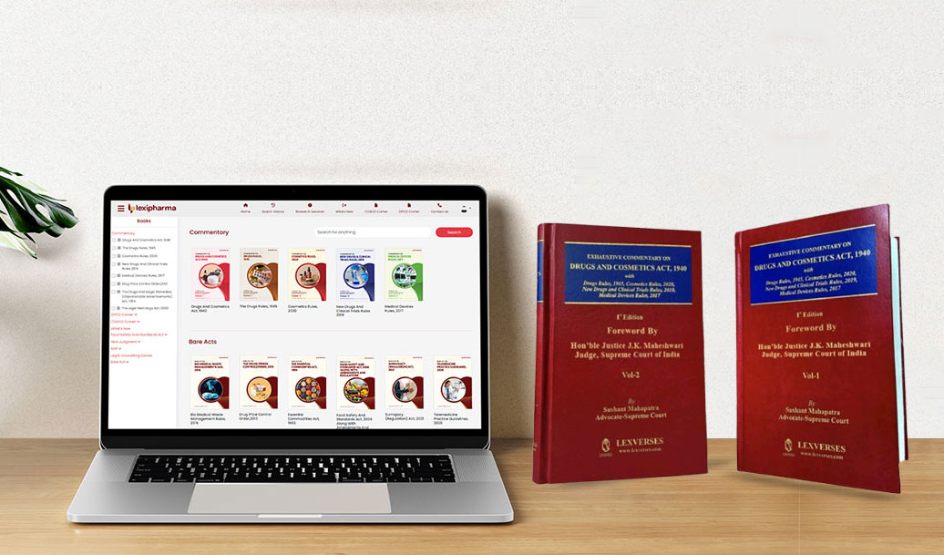 The portal features a book titled ‘Exhaustive Commentary on the Drugs and Cosmetics Act, 1940, along with Allied Rules’, written by Mr. Sushant Mahapatra, a distinguished advocate of the Hon'ble Supreme Court of India and the head of the Mace Corporate Associates.